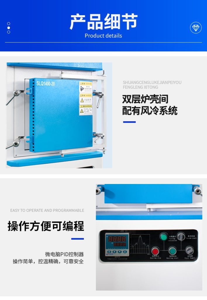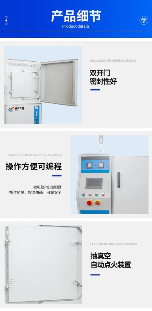 The vacuum system of the atmosphere furnace adopts special design technology, featuring safe and convenient operation, good vacuum level, an ultimate vacuum of up to 0.1 MPa, good sealing performance, and long vacuum maintenance time. This atmosphere furnace can introduce various atmospheric gases such as oxygen, nitrogen, and hydrogen. The maximum atmospheric pressure is 0.1 MPa. It uses a unique water-cooled sealing technology at the furnace port, which can maintain pressure for a long time, has good safety performance, and is easy to operate.